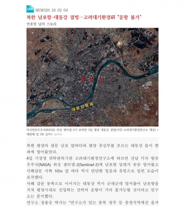 북한 남포항-대동강 결빙…고려대기환경硏 “운항 불가” - 뉴시스 (2026. 02. 04.)