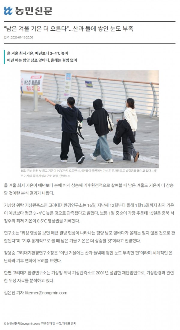 “남은 겨울 기온 더 오른다”…산과 들에 쌓인 눈도 부족 - 농민 신문 (2026. 01. 16.)