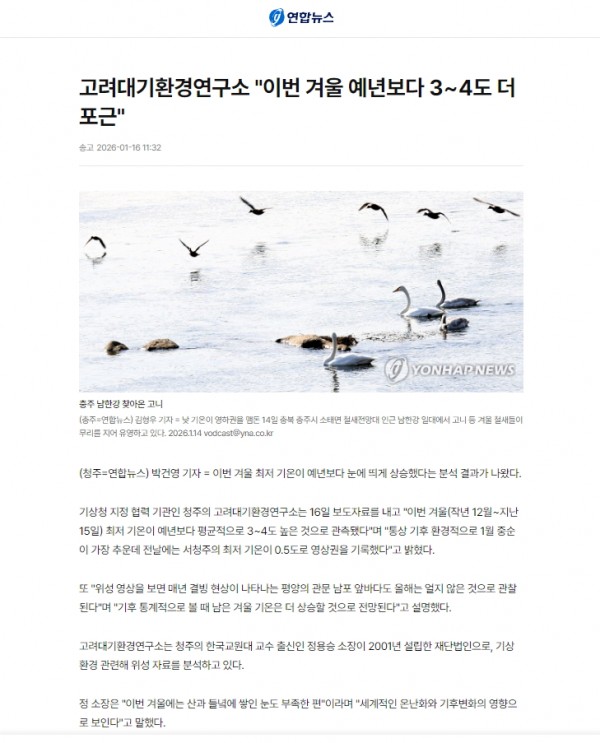 고려대기환경연구소 “이번 겨울 예년보다 3~4도 더 포근” - 연합뉴스 (2026. 01. 16.)