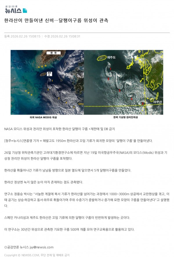 한라산이 만들어낸 신비…달팽이구름 위성이 관측 - 뉴시스 (2026. 02. 26) > Newspapers