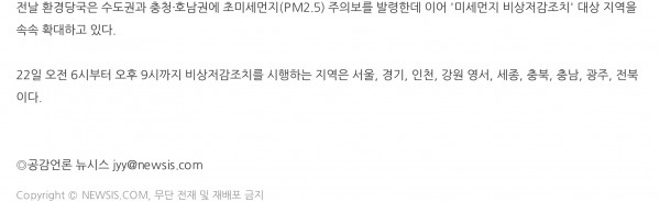 중국발 미세먼지 한반도 습격…대기온도 올라 건조한 탓 - 뉴시스 (2025. 01. 22.) > Newspapers