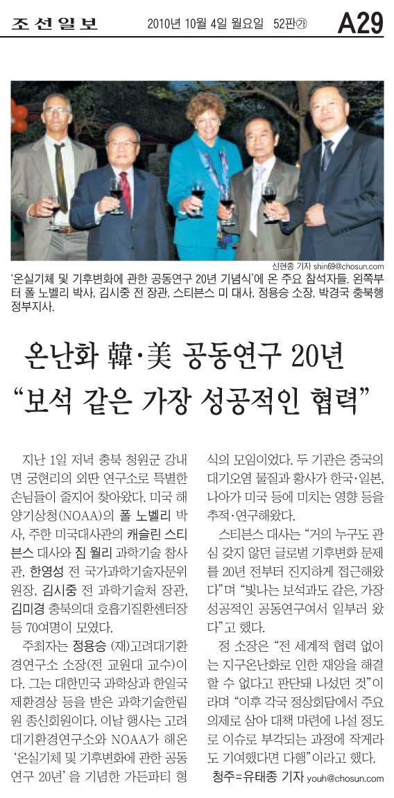 온난화 한·미 공동연구 20년 “보석 같은 가장 성공적인 협력” - 조선일보 (2010. 10. 04) > Newspapers